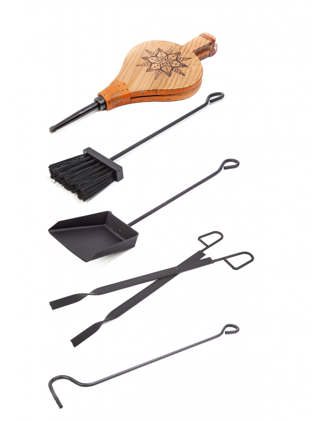 - consta de 5 utensilios: fuelle, escobillero, recogedor negro, tenaza de 45 cm, atizador